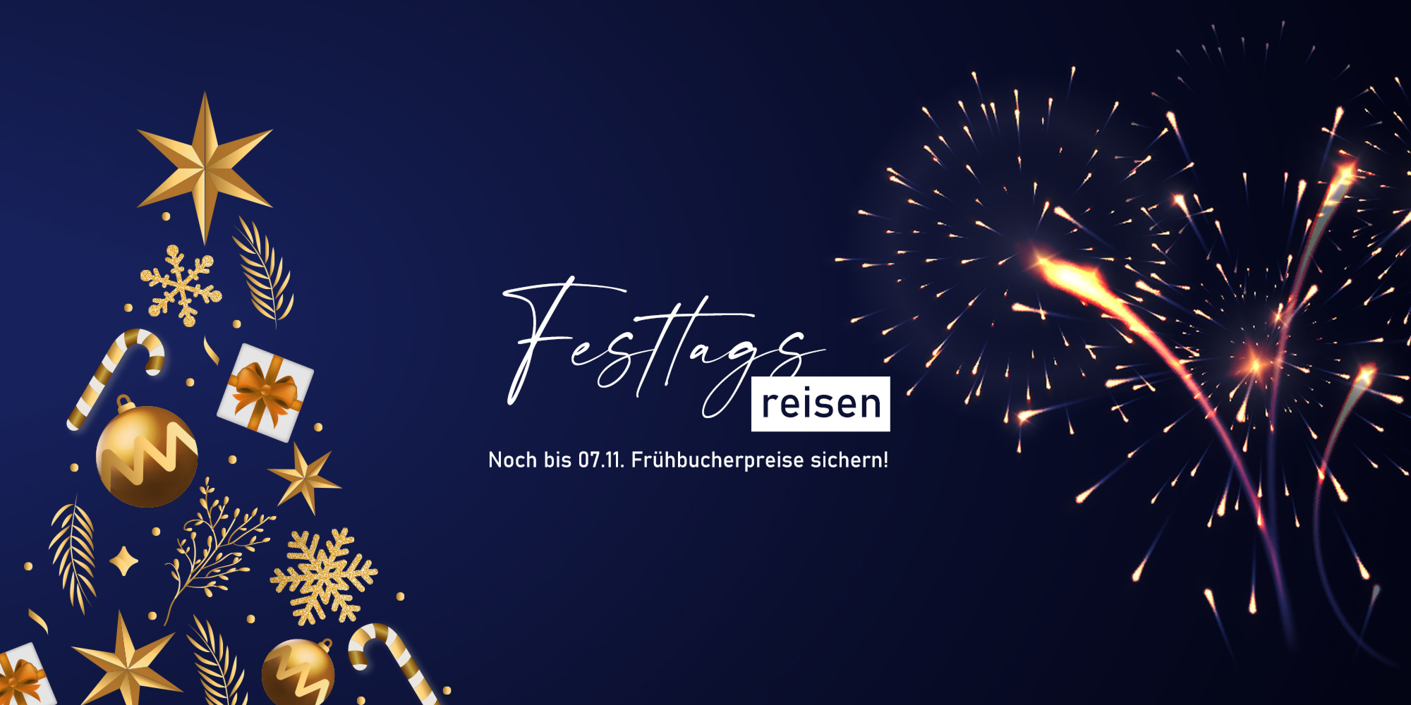 Nicht schon wieder Socken oder Parfum auf dem Gabentisch! Schenken Sie sich zu Weihnachten und Silvester stattdessen eine wunderschöne Zeit! Ob im Süden oder Norden - das Ziel ist immer dasselbe: herrlich entspannte Tage in idyllischen Regionen und festlich erleuchteten Städten. Suchen Sie sich jetzt gleich Ihren Sehnsuchtsort von unserem „Gabentisch“ und machen Sie die Bescherung zur Schnäppchenjagd, denn noch bis 7.11. gelten attraktive Frühbucherpreise für Ihr Weihnachts- und Silvestervergnügen.