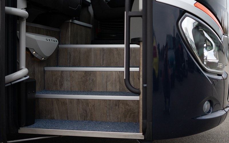 Seit jeher gehen wir beim Thema Sicherheit keine Kompromisse ein. So haben wir auch bei der neuen Fahrzeugflotte den höchstmöglichen Sicherheitsstandard, den es in Bussen gibt, im Einsatz: Active Brake Assist 4, Abstandsregeltempomat, Attention Assist, Spurassistent und hochwirksame passive Systeme wie der Front Collision Guard unterstützen unsere Reisebus-Chauffeure im täglichen Einsatz.