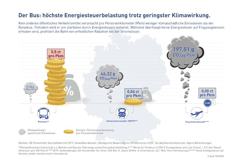 Busreisen sind eine sehr ökologische Art des Reisens. Im Vergleich zu anderen Reiseformen sind Busreisen wesentlich umweltschonender und sorgen für mehr Platz auf Straßen und in Innenstädten. Gemessen am Primärenergieverbrauch benötigt ein Reisebus für die Bereitsstellung, die erforderliche Infrastruktur und den grundsätzlichen Betrieb je Personenkilometer nur die Hälfte der Bahn und nur ein Drittel des Pkw-Bedarfs. Ein Bustourist verursacht im Vergleich somit weniger Luftschadstoff und Feinstaub sowie auch Lärm. Mit Ihrer Entscheidung für den Bus treffen Sie also auch eine ökologische Wahl für Ihre Urlaubsreise!
