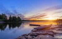 3 Finnisches Lappland [570 km]. Über die Grenze und hinein in eine andere Welt: stille Seen, endlose Moore, Wälder wie grüne Teppiche. Und plötzlich – ein Rentier auf der Straße, so gelassen, als gehöre sie Ihm. Muonio liegt am gleichnamigen Fluss, hier spürt man die Ruhe Lapplands. Haben Sie schon einmal die Mitternachtssonne erlebt? Hier könnten Sie es. [F/A/Ü]